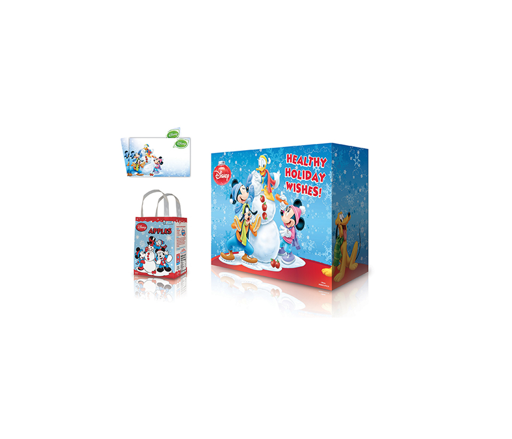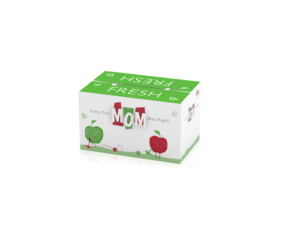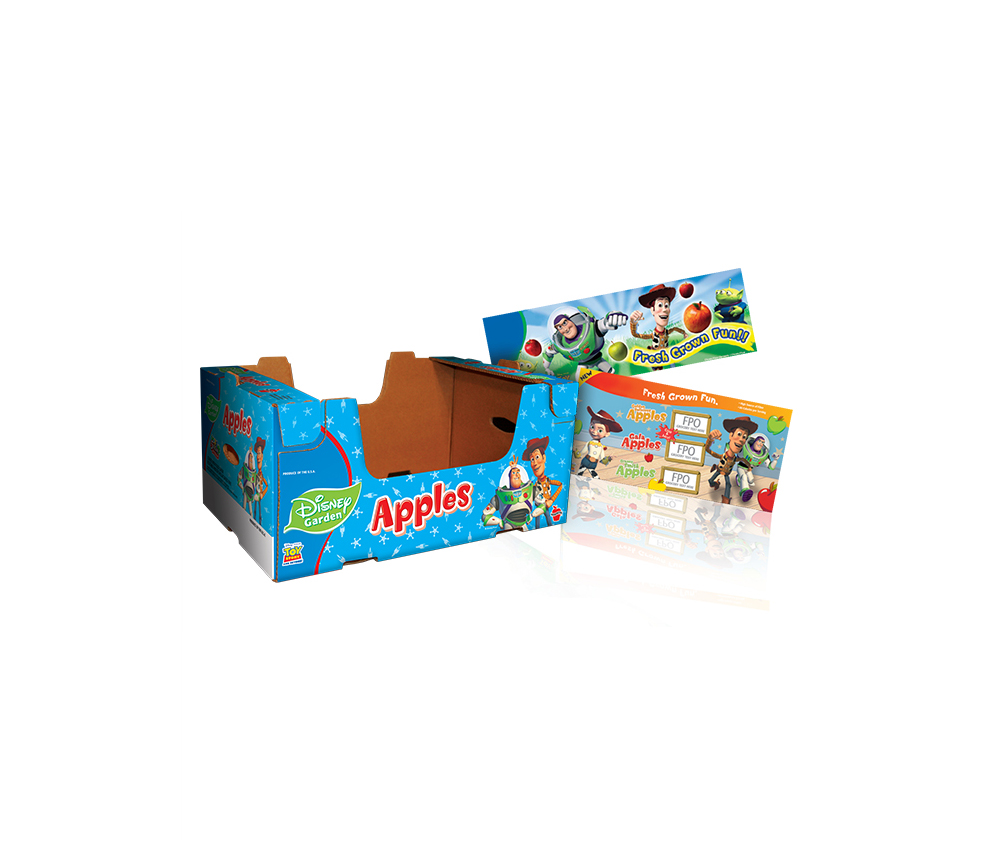 Hunnyz Apples 40lb Box. The artwork on the box expands to create a large display panel when multiple boxes are stacked.